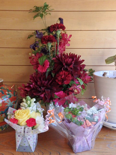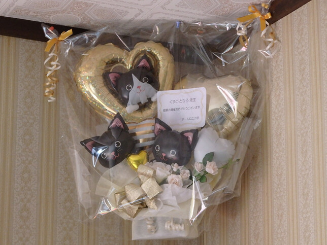 お花沢山、バルーンは空に 2022年02月28日 カテゴリ:彫刻制作 今回の個展では…お客様から、沢山のお花を頂きました!どうもありがとうございます!昨日、家に持ち帰って早速飾って、楽しんでいます。深みのある、妖艶な赤の花束わたしが制作した…妖(あやかし) 和にゃんこ彫刻のイメージにぴったりで、うれしいです!玄関先は、程よく陽が当たりますし…出かけるとき、帰って来た時に真っ先に目に入る場所なのが良いですね!そして、アールねこの手さんから頂いたうちのねこ3をモデルにしてくださったバルーンアートは、あまりにもうちのねこ3ご本人達が興味津々すぎたので…作業机すぐ上の、天井付近に固定しましたよ!これなら、壊されることなく劣化も抑えられて、長期間楽しめそうです。皆さん、どうもありがとうございます!