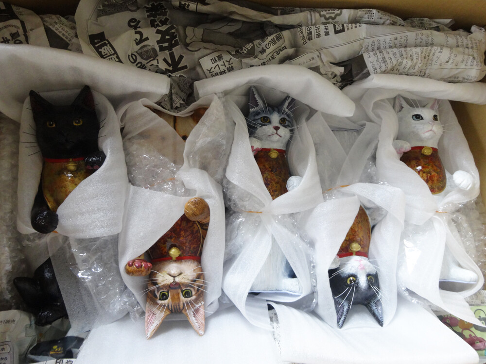 ねこふく5招き猫、発送! 2022年08月31日 カテゴリ:彫刻制作 昨日完成した、ねこふく5招き猫。やはりこの季節は、粘土も絵の具も仕上げの保護材も、乾くのが早いです。昨日の段階で、しっかり乾いていたので今日、早速発送ですよ!今回は、だいぶ大きめのダンボールです。緩衝材をたくさん入れて…5招き猫を並べたら…動かないように、上から抑えつつ5枚の小判をくっつけます。そして、いつものクロネエヤマトさんへ!明日の午後、到着の予定です。どうかどうか、無事に届きますように!