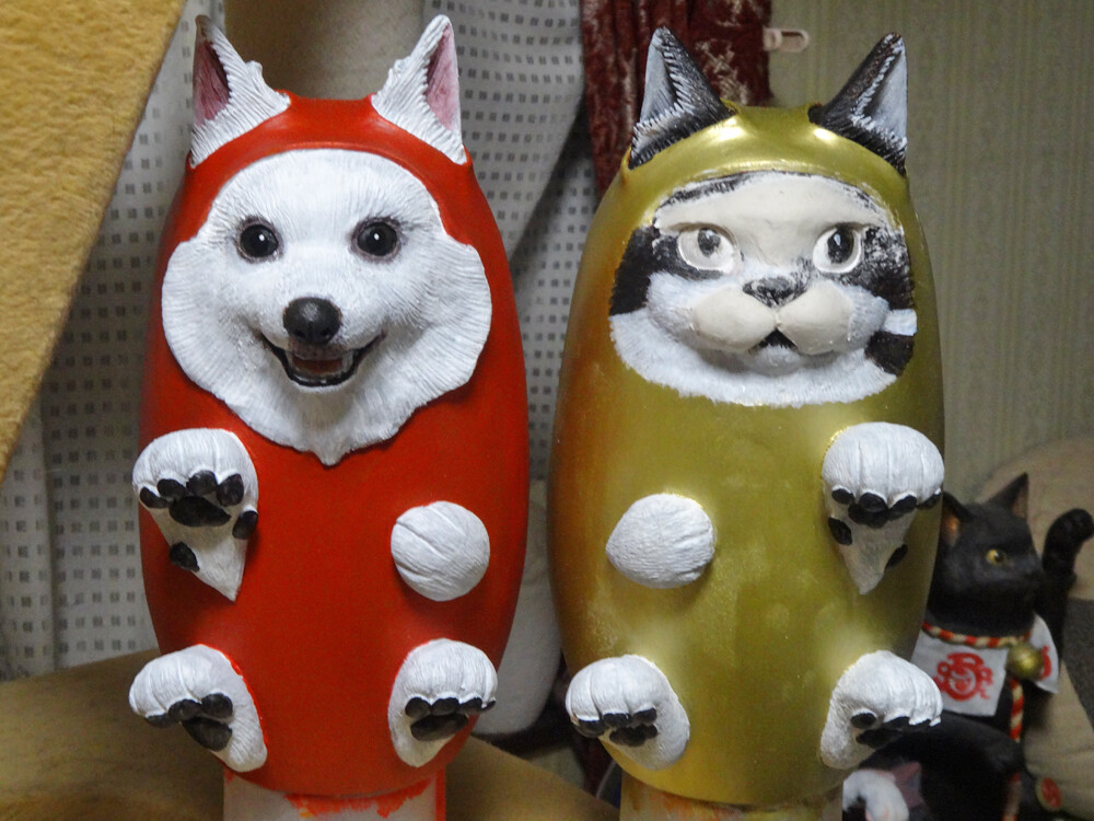 小町ぱんだるまねきねこ&いぬ制作・27 2022年08月31日 カテゴリ:彫刻制作 今日の、小町さんだるまねきねこ&アナベルさんだるまねきいぬ制作です。今日も、ねこの小町さんの顔の造形の修正です。昨日盛った粘土が乾いたので…毛並みを彫りました。今日中に、目元をもう少し整えておけば明日には、下地塗りと色塗りが出来るのではないかと。引き続き、アナベルさんの色塗りも進めていきますよ!
