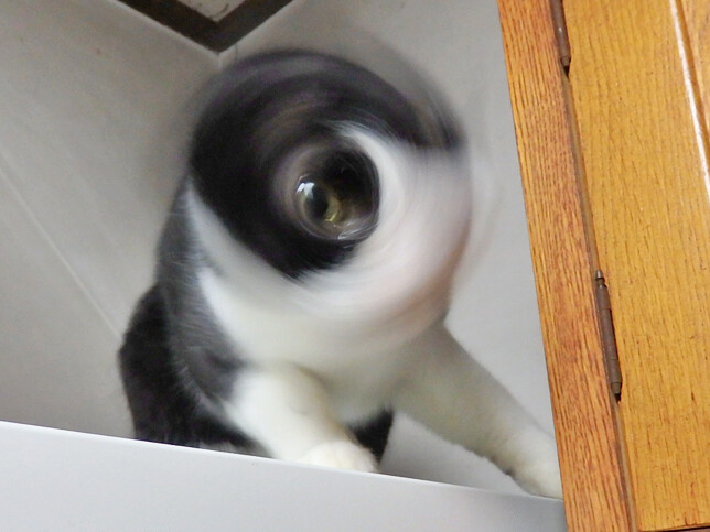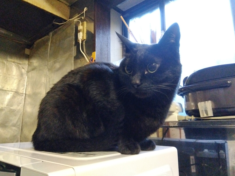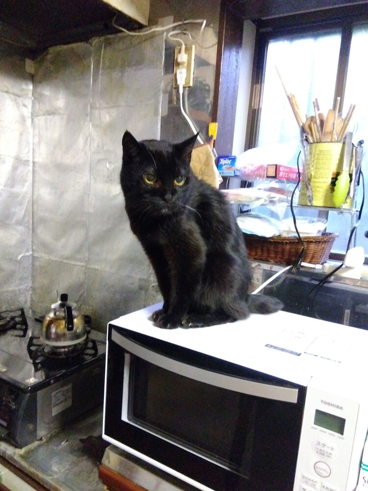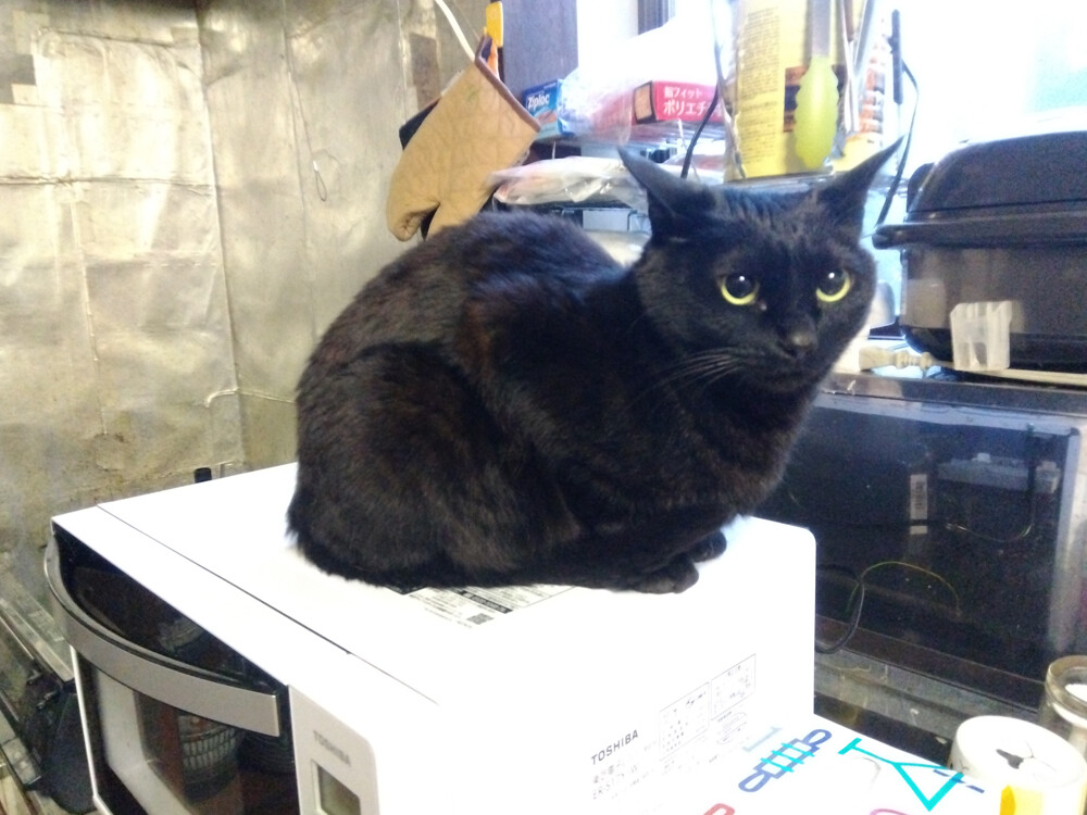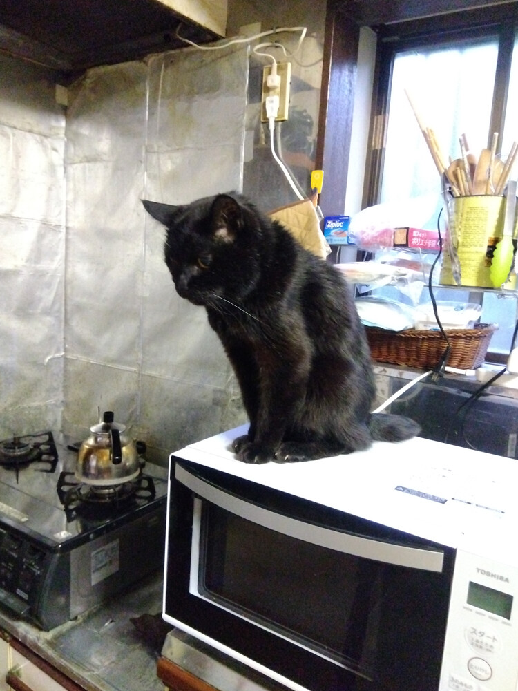 のらみゃんどんどん長く 2026年04月15日 カテゴリ:のら3ゃん はっきりしない空模様の群馬ですが、十分暖かいです。朝ご飯を食べ終わったくろねえさんは…電子レンジの上。今日は、気分が良いそうで…写真のモデルさんをしてくれました。あかるちゃんは…2階北の窓から外の様子を見回っています。あ、なんだか…どんどん長くなりますね…!もう少しで雨、降るかも。