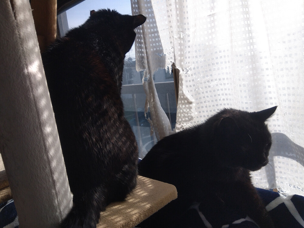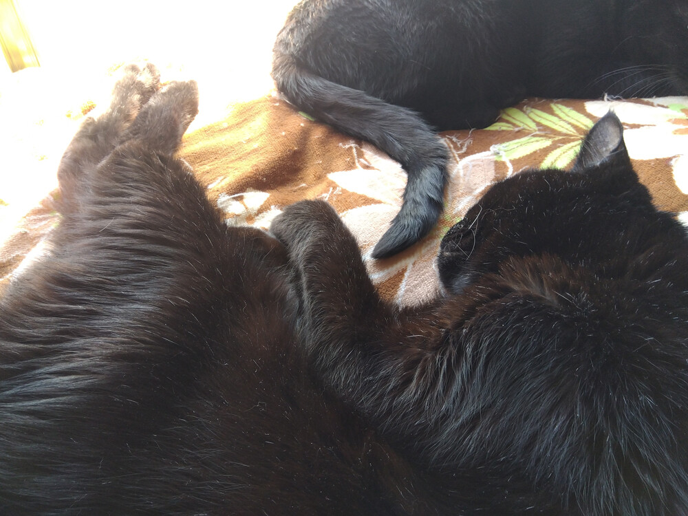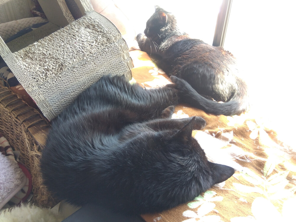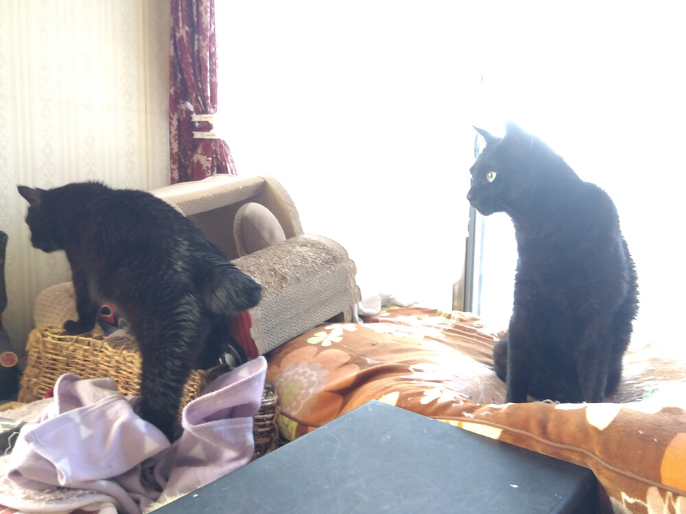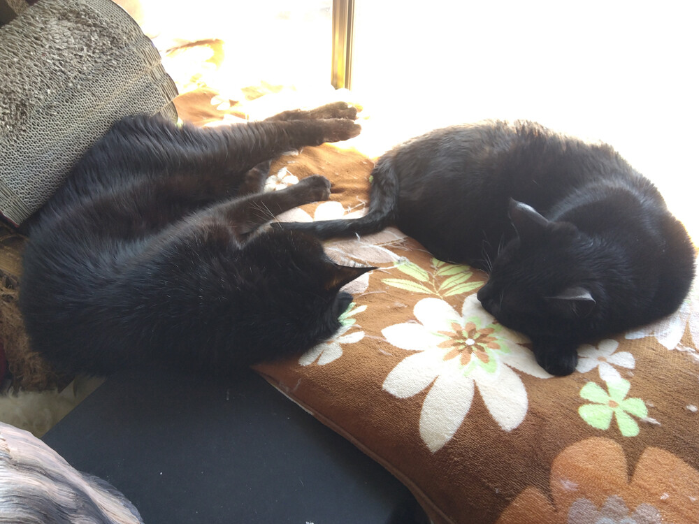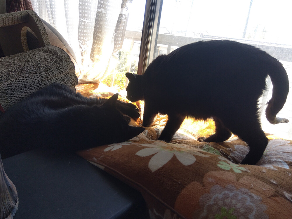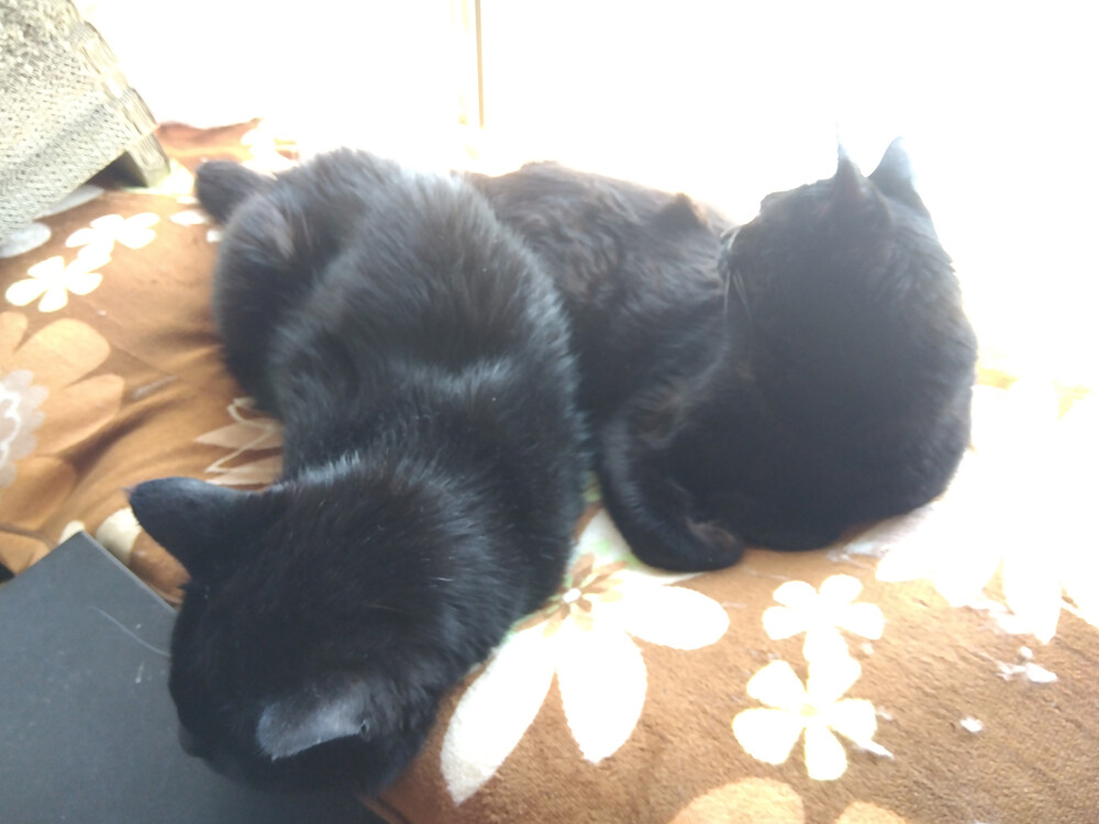のらみゃん平和な窓辺 2026年04月09日 カテゴリ:のら3ゃん 今日は、朝からいい天気。朝ご飯を食べ終わった黒女子おふたりは…南の窓辺に集まります。凸凹してるところにハマってるのが、くろねえさんで…くろねえさんのお顔の前でしっぽをちょろちょろしてるのがあかるちゃん。あれ、あかるちゃん奥に移動して…今度は、くろねえさんの足をしっぽで包んであげているよう。仲が良いですね。しばらくしたら…ぴったりくっつきました。南の窓辺は、平和だね。
